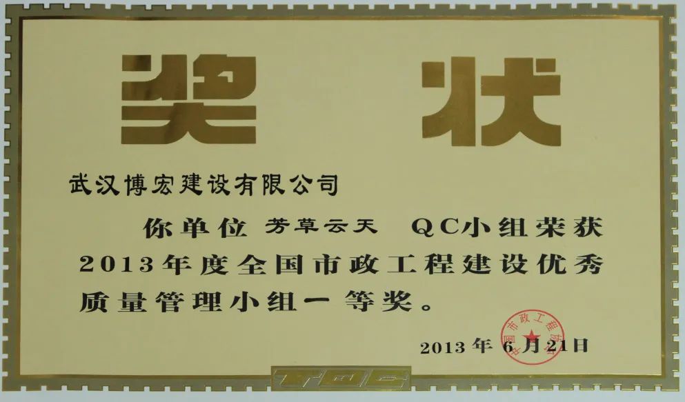 芳草云天QC小組成立于2011年5月31日,本小組從企業(yè)經(jīng)營戰(zhàn)略、方針目標(biāo)和現(xiàn)場(chǎng)存在的問題出發(fā),以提高效能、降低消耗、實(shí)現(xiàn)經(jīng)濟(jì)與社會(huì)效益雙贏為目的,全面優(yōu)化項(xiàng)目質(zhì)量。歷年來追求卓越、探索新品,曾獲得2013 年全國市政工程建設(shè)協(xié)會(huì)優(yōu)秀QC成果一等獎(jiǎng)、2014年湖北省市政工程建設(shè)優(yōu)秀QC成果二等獎(jiǎng)、2015年湖北省市政工程建設(shè)優(yōu)秀 QC成果一等獎(jiǎng)、2022年度中國施工企業(yè)管理協(xié)會(huì)工程建設(shè)質(zhì)量管理小組活動(dòng)成果二等獎(jiǎng)、2022年中國建筑業(yè)工程建設(shè)質(zhì)量管理小組活動(dòng)成果三等獎(jiǎng)等榮譽(yù)。