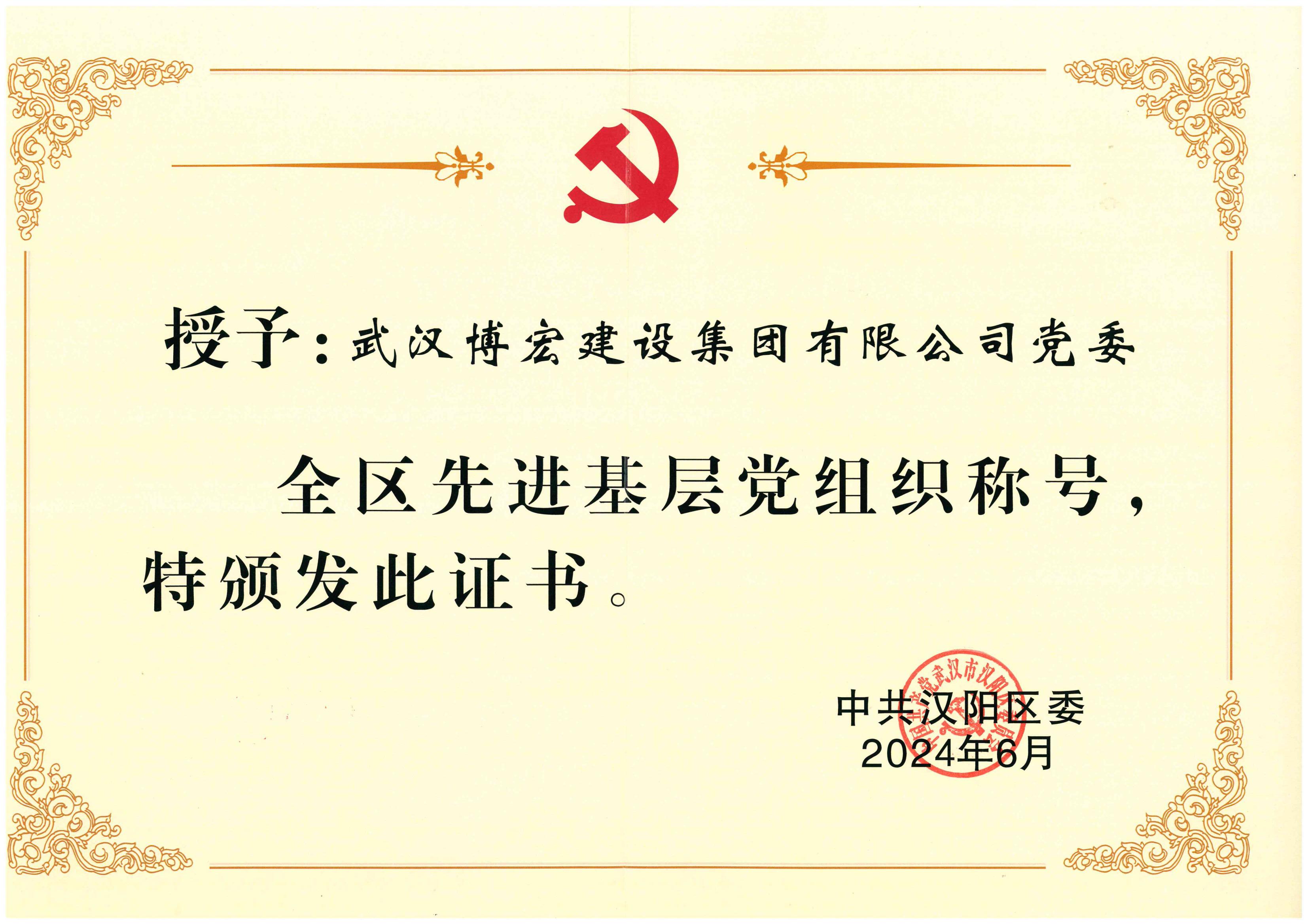 6月28日,漢陽區慶祝中國共產黨成立103周年大會在區機關1號會議室隆重召開,大會對全區優秀共產黨員、優秀黨務工作者、先進基層黨組織進行了表彰,中共武漢博宏建設集團有限公司委員會獲評漢陽區“先進基層黨組織”榮譽稱號。
